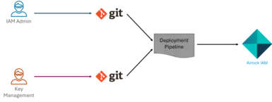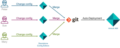 Stellen wir uns vor, Peter soll die Konfiguration anpassen, um eine neue Anwendung zu unterstützen. Nach Abschluss und Validierung seiner Änderungen überträgt er diese ins Repository. Da kein anderer Administrator aktiv war, gibt es keinen Konflikt. Der automatisierte Deployment-Prozess übernimmt die neue Version und verteilt sie an die entsprechenden Airlock IAM-Installationen, die die Konfiguration erkennen und automatisch aktivieren.